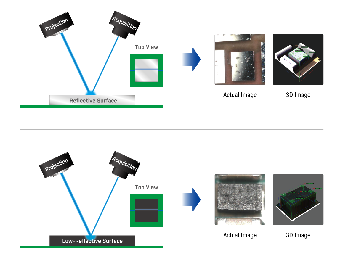 Die patentierte 12-Projektionen-Digital-Blaulicht-Moiré-Technologie von MIRTEC ermöglicht eine präzise und stabile 3D-Inspektion, die unabhängig von der Farbe des Bauteils oder Substrats ist.