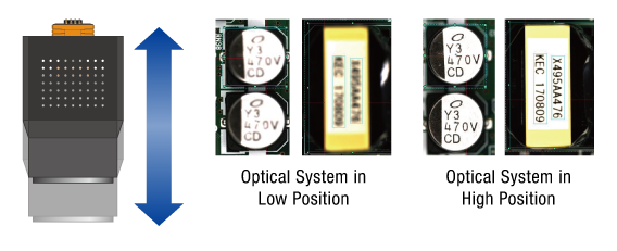 OCR Inspection for Tall Parts (Option)By installing Z-axis mechanism on the optical system, characters on the upper surface of tall parts can be recognized and inspected.