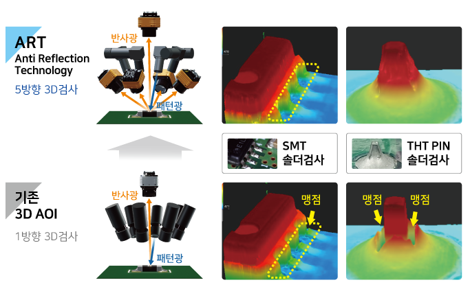 또한, 이같은 구조적인 이점은 상단 카메라로만 3D를 측정할 때 피할 수 없는 솔더 조인트의 맹점 문제도 해결합니다.