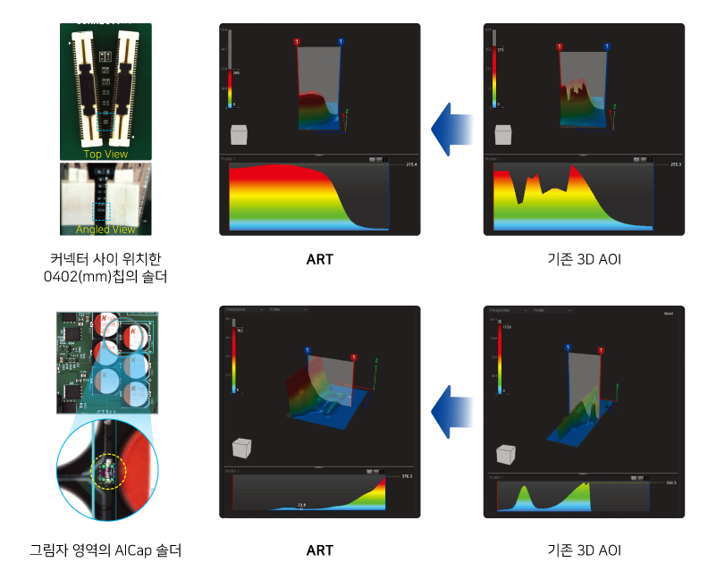 다각도 카메라로 인해 ART는 일반 3D AOI 대비 그림자로 인한 측정 불가 문제에 더 쉽게 대처할 수 있습니다.
